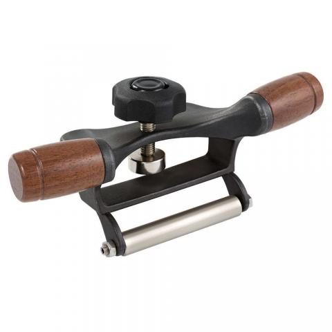 With its large clamping surface, this high-quality cast iron sharpening guide is ideal for sharpening irons for Japanese planes and very wide chisels. The long support roller prevents tipping during sharpening. Lightweight and comfortable to handle thanks to the wide side handles made of walnut wood.