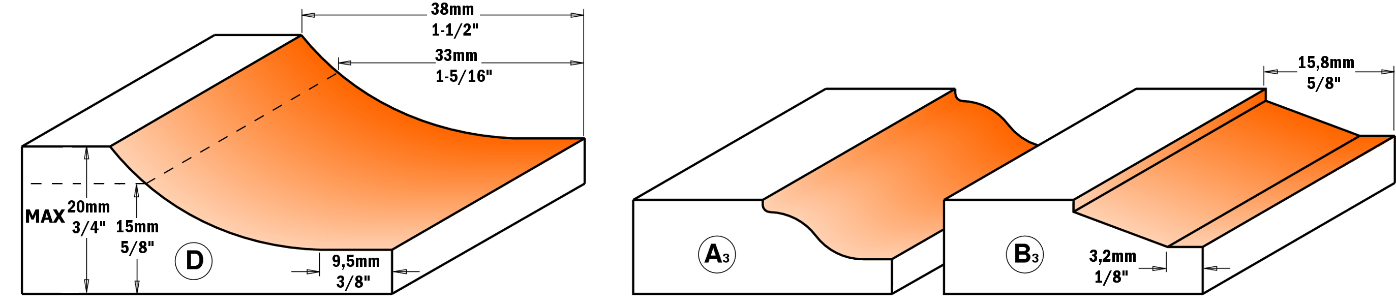 Questo utensile tradizionale, disegnato con accuratezza, realizzato con le migliori tecnologie ed estremamente curato nei particolari, è una delle pietre miliari nel lavoro dell'artigiano. Siamo tanto orgogliosi di questo nostro prodotto quanto lo siete voi dei vostri. Scegliete un utensile tra i quattro profili usuali qui di seguito illustrati. Il corpo di ogni fresa è studiato secondo il principio della limitazione del contraccolpo, un dispositivo di sicurezza che dovreste sempre esigere negli utensili a grande diametro.